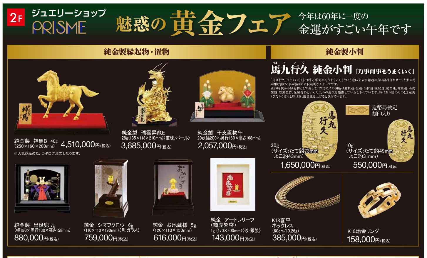 また2階プリズムコーナーにおいては、黄金フェアを同日開催しております。